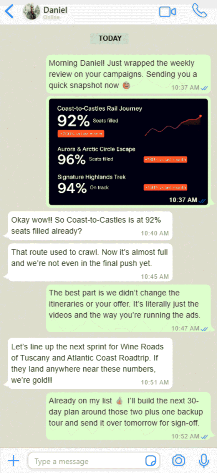 Right now, your best tours leave with empty seats. We rebuild your creatives and ads so promoted departures routinely push into the 90–100% full range.